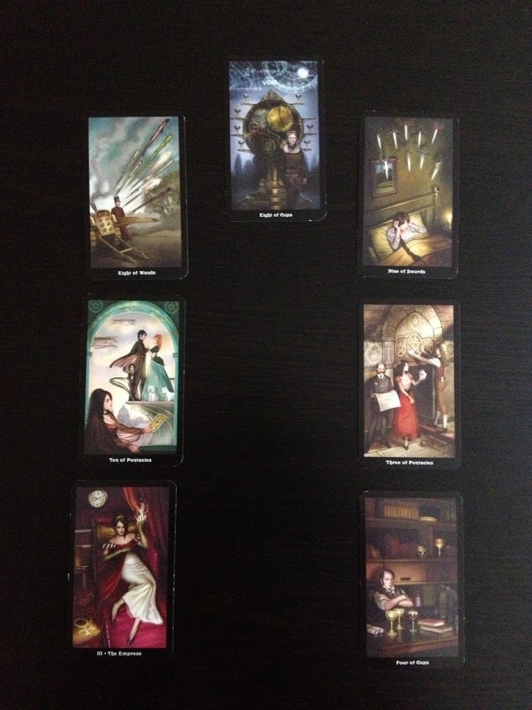 Then I took my time to focus my energy on my situation and using the stunning Steampunk Tarot (honestly if you don’t have this deck, GET IT, like right here – http://www.amazon.com/The-Steampunk-Tarot-Barbara-Moore/dp/0738726389/ref=sr_1_1?ie=UTF8&qid=1371263000&sr=8-1&keywords=The+Steampunk+Tarot )