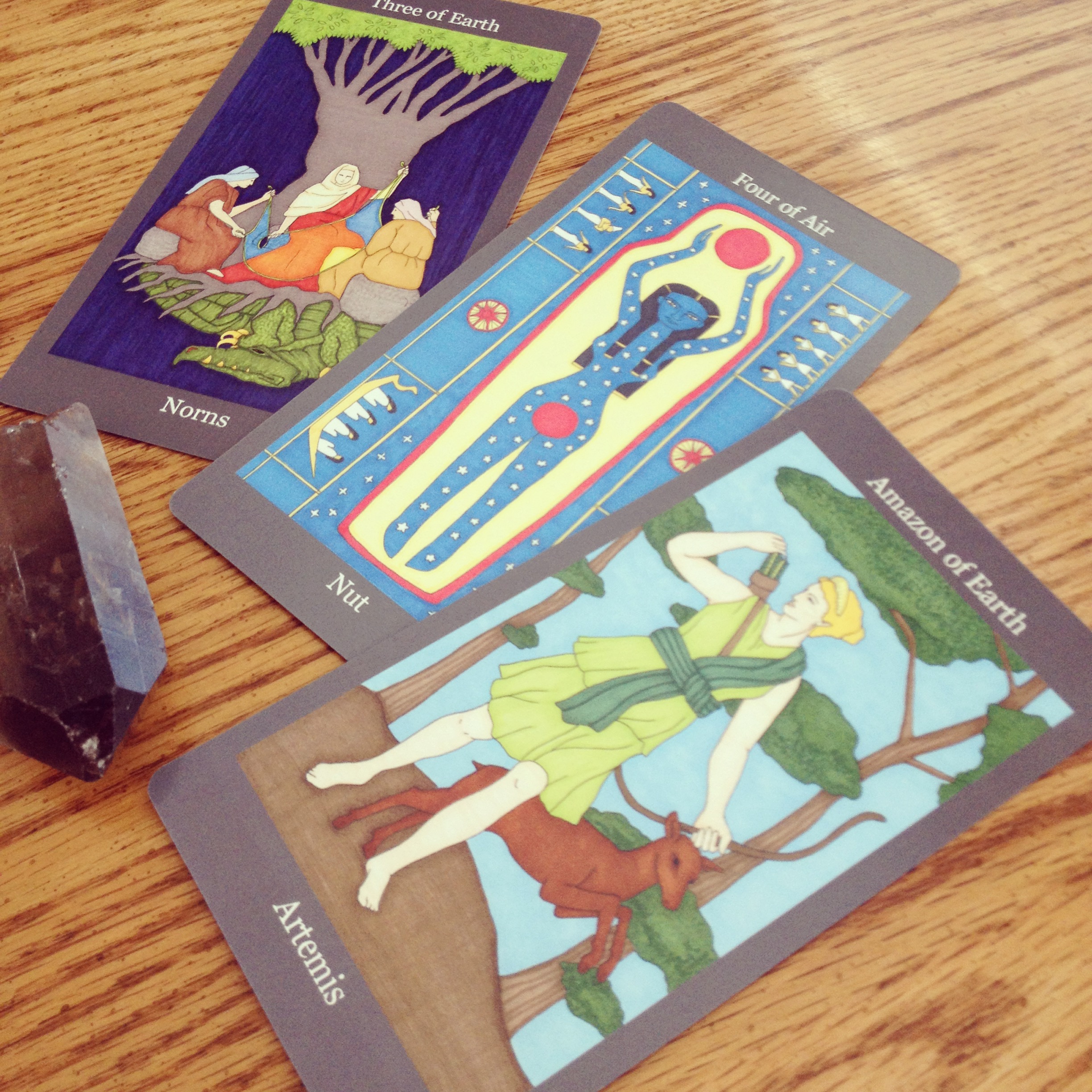 It’s integral. It’s become my primary way of having a conversation with my goddess, and we have a nice chat every evening before I go to bed. But Tarot has been part of my spirituality from the beginning of my relationship with the cards. In 1985 I shyly attended a women’s spirituality retreat, looking to participate in a movement I had only read about until then. The experience opened up a new world within me as well as connecting me in a deeper way to the world around me. One of the women there had a deck of round cards, the Motherpeace Tarot. Out of curiosity I asked to see them. As I turned over the cards, I was stunned to find images that I’d seen in my trance the day before: a leopard woman (The Magician) and a snow goddess (Priestess of Swords). Later in the week, this same woman gave me my first tarot reading using these cards. One thing she said to me stays with me to this day–that it was time to “take off the little Ellen suit, and let the great big Ellen inside come out.” Then she gave me the tarot deck, saying “I think I brought this here for you.”