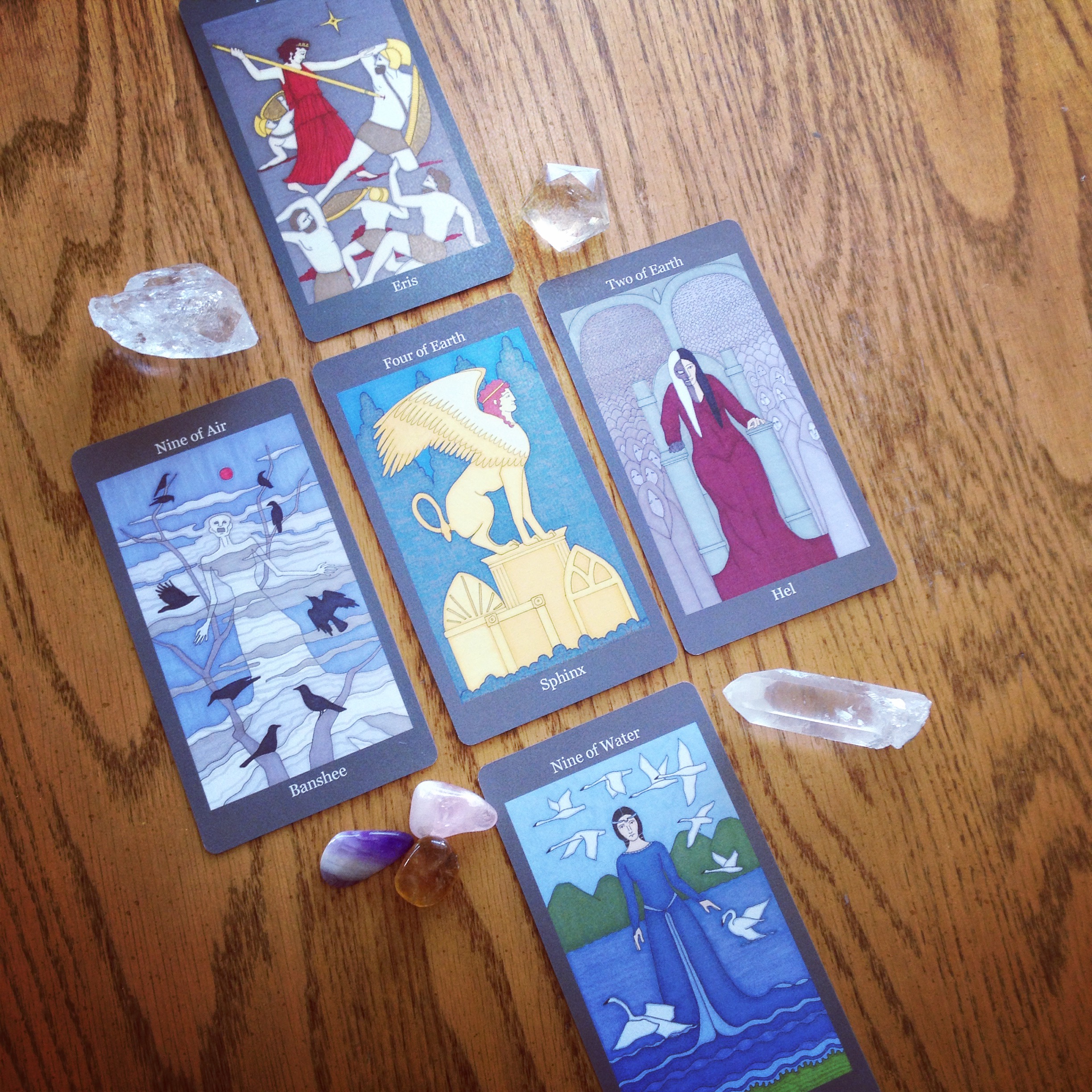 Coming soon is a Majors-only deck I created as a personal spiritual journey, a series of tarot prayer cards for the Hindu goddess Kali. Already out is the Minoan Tarot, a 78 card deck based on the artifacts and culture of ancient Crete. The deck was a joy to create and I find using it has been a most wonderful antidote to despair. Because it is no fantasy that a goddess loving, sexually open, and technologically advanced society existed; it is part of our true history. In the works is a Greek Goddess Tarot.