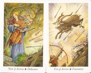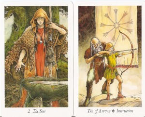 The First Day I pulled the Five of Arrows with the key word of Frustration on the card. The Second day I pulled Nine of Arrows with the key word of Dedication on the card. The third day I pulled The Seer (A Major Arcana Card) and the fourth day I pulled the Ten of Arrows with the key word of Instruction on the card.