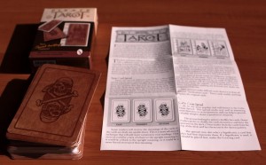 Rider-Waite-Smith based deck were carved onto wood and released as a limited edition set. Finally published in card format along with quick instructions on how to use these cards for fortune telling and also a medieval card game.